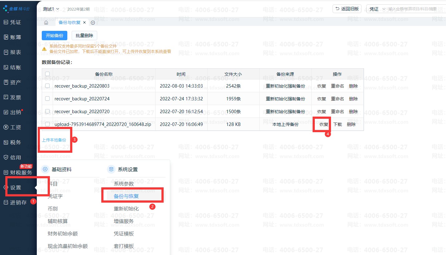 3、云会计创建账套成功,进入账套后点击【设置】-【备份与恢复】-【上传备份】-【恢复】即可