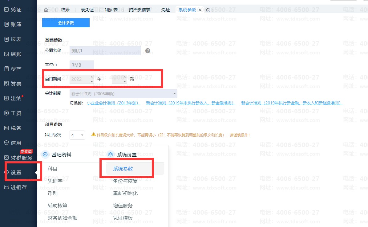1、【设置】-【系统参数】,可查看账套的启用期间