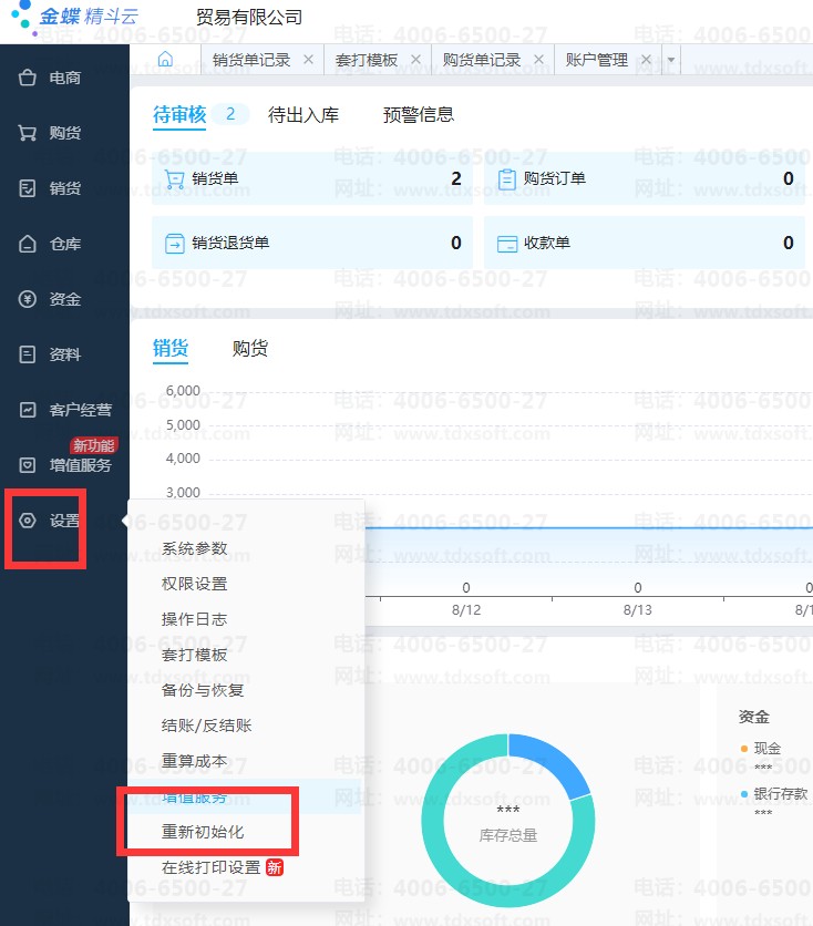 3、进销存客户,如启用了网店功能的,重新初始化会导致此功能失效,请慎重考虑后方进行操作;