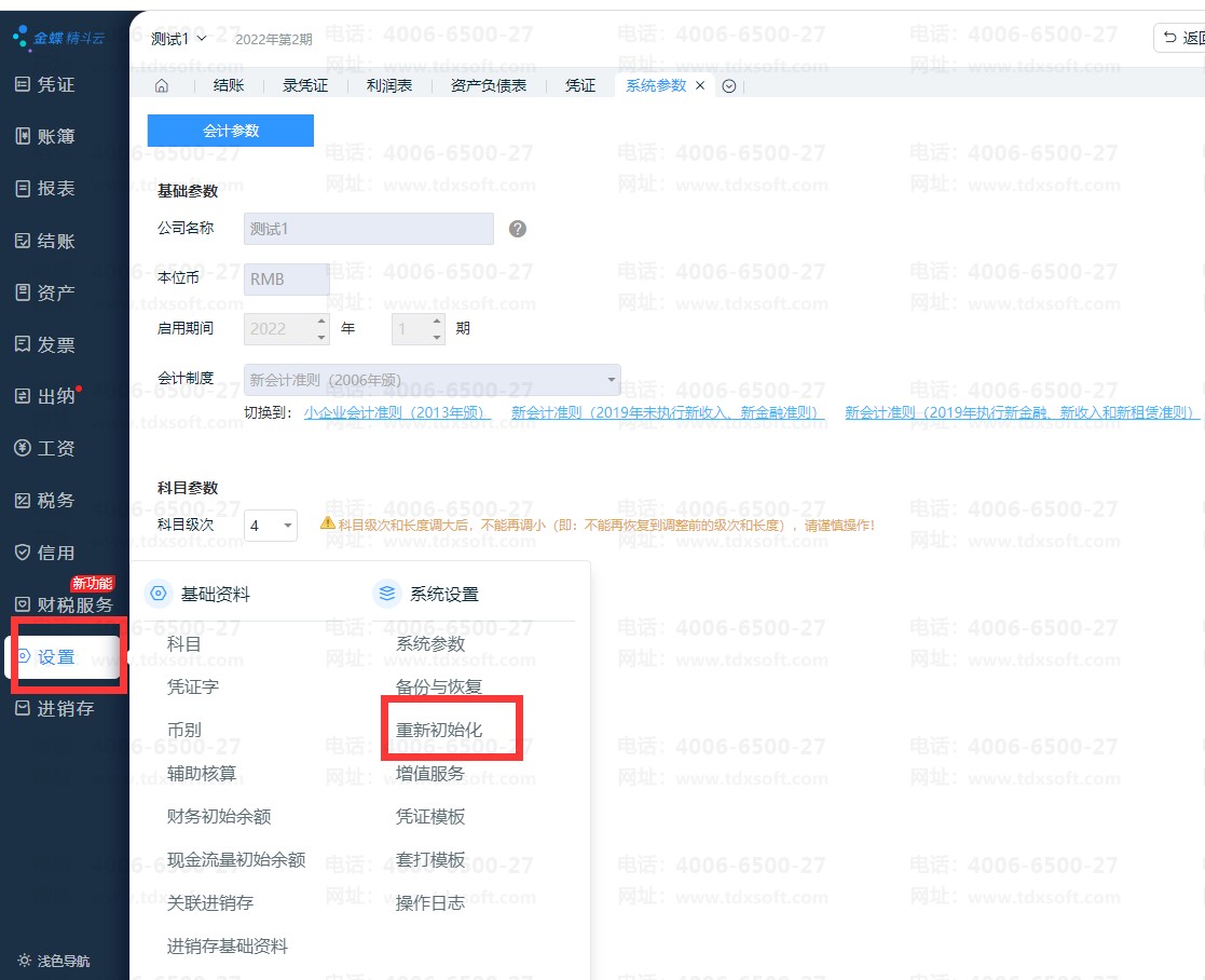 2、用管理员登录,【设置】-【重新初始化】,操作后将清空账套所有信息,再重新建账选择启用期间,请慎用
