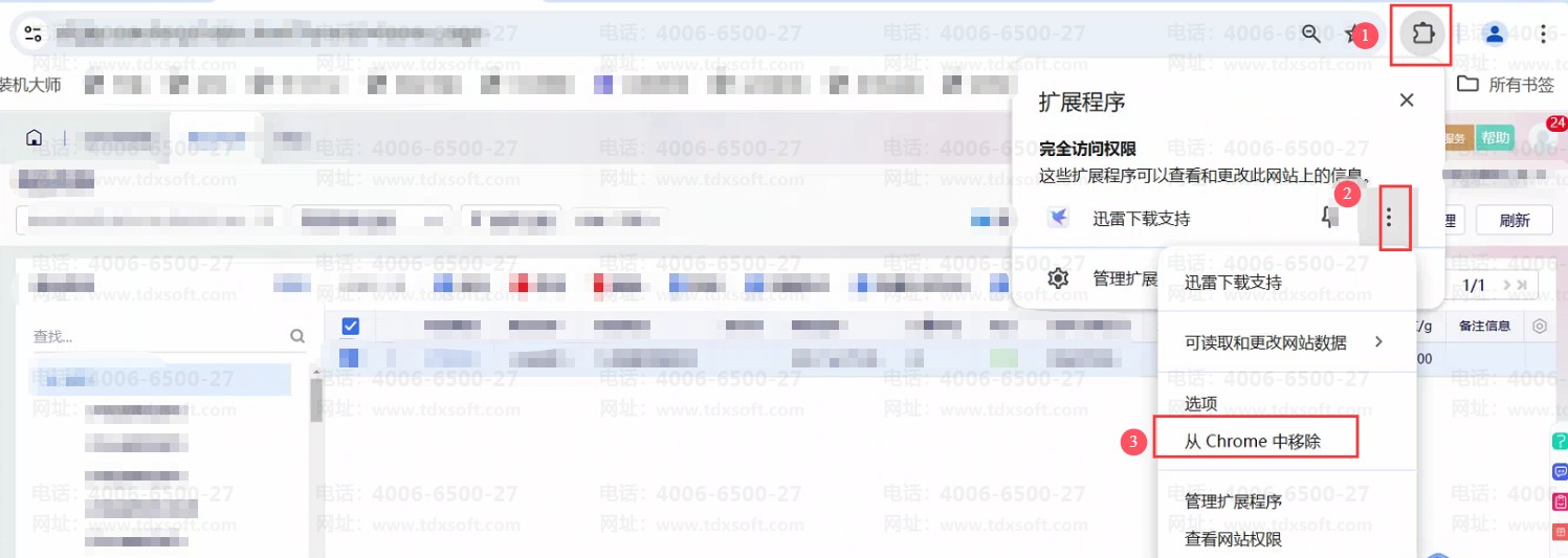 1、关闭:点击浏览器右上角【扩展程序】,找到第三方下载软件,然后点击【从Chrome中移除】,如图所示。