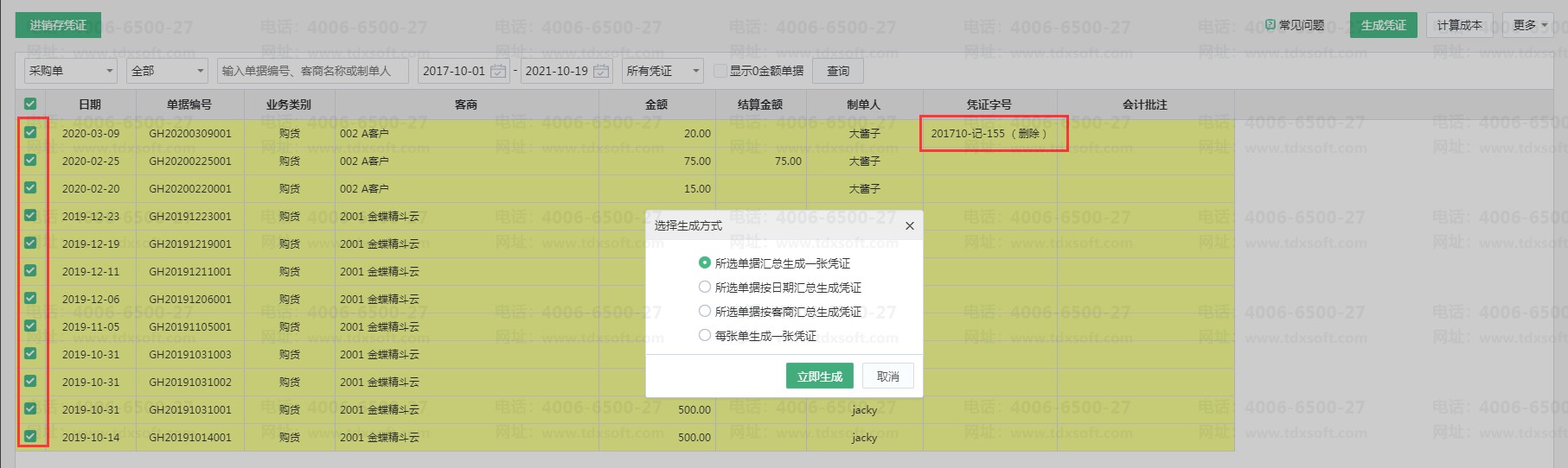 取消勾选已经生成过凭证的单据,重新批量生成凭证。