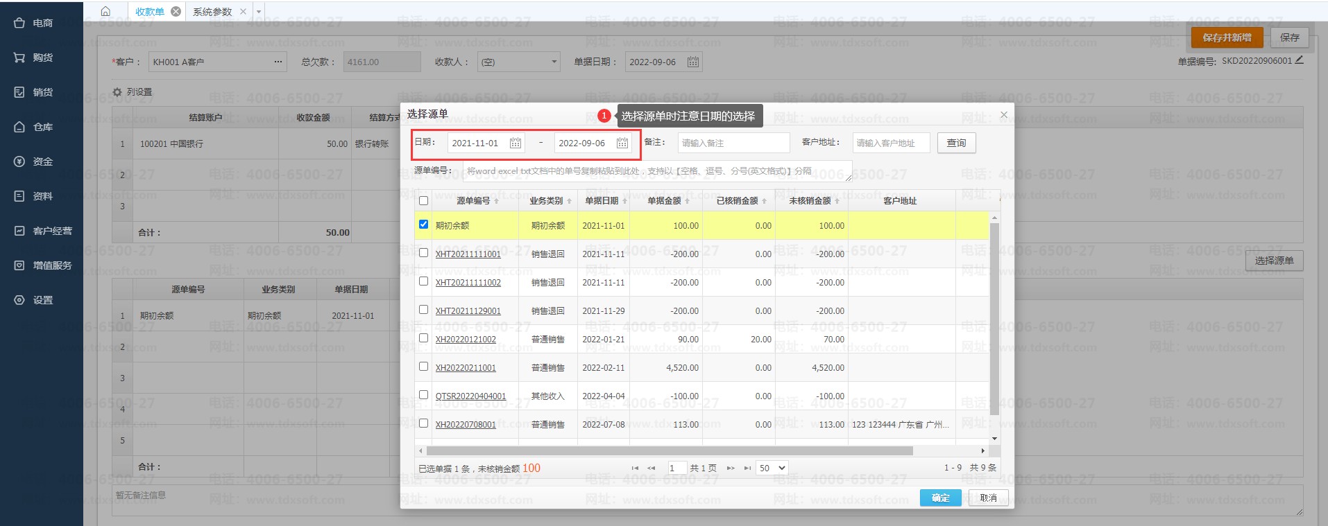 2、在录入收款选择源单时注意日期的选择,查询日期要包含期初的余额日期。