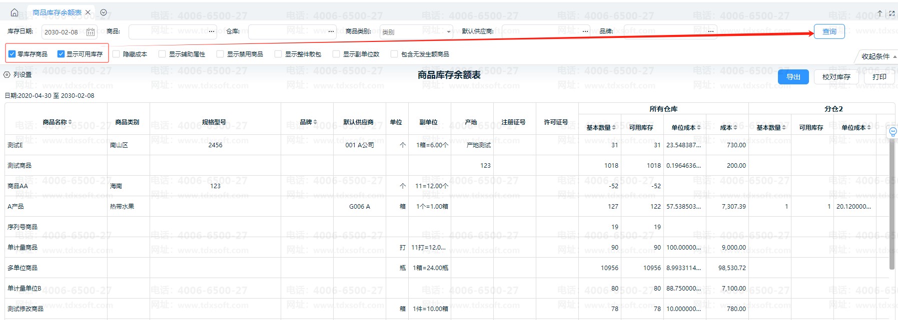 在筛选条件中,展开筛选条件,勾选“零库存商品”和“显示可用库存”并将查询的日期放大,再查询,如图:
