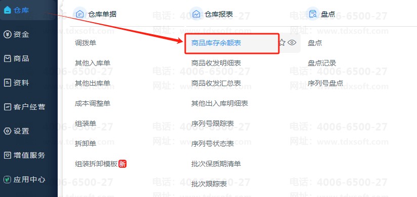 首先,点击打开【仓库】-【商品库存余额表】界面