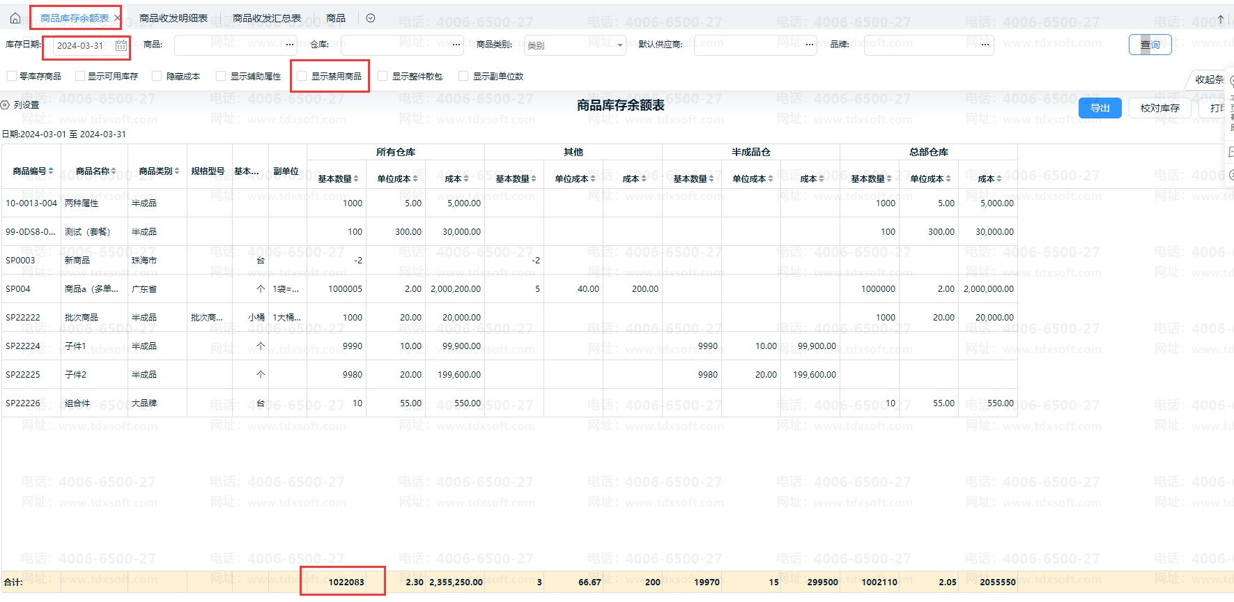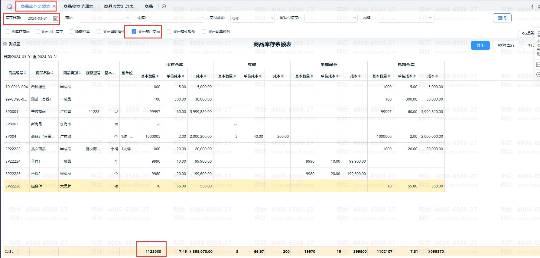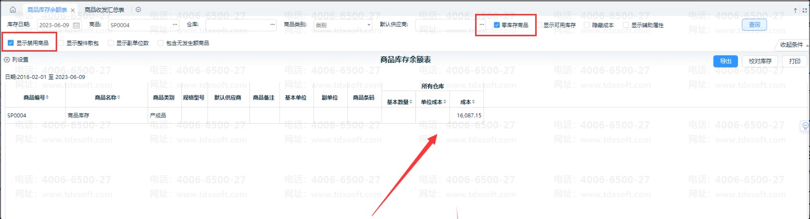 特别查询【商品库存余额表】时,同时勾选“零库存商品”、“禁用商品”。