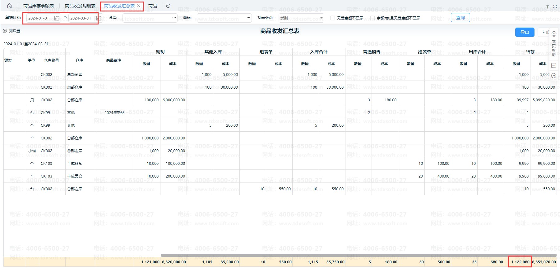 2、商品收发汇总表(商品收发明细表):默认是包括了零库存商品和禁用商品,若报表查询余额数量有差额时,可以先检查相关的筛选条件。