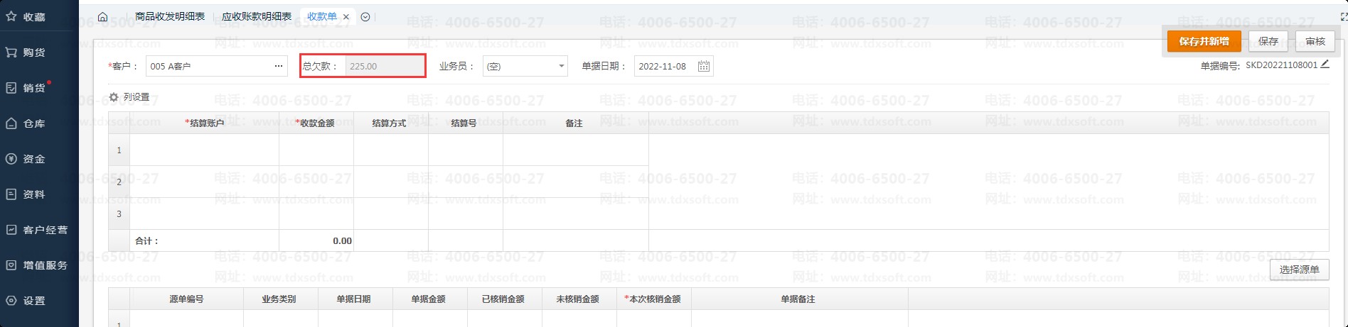 2、收款单显示的总欠款:取的是“往来单位欠款表”的应收款余额。