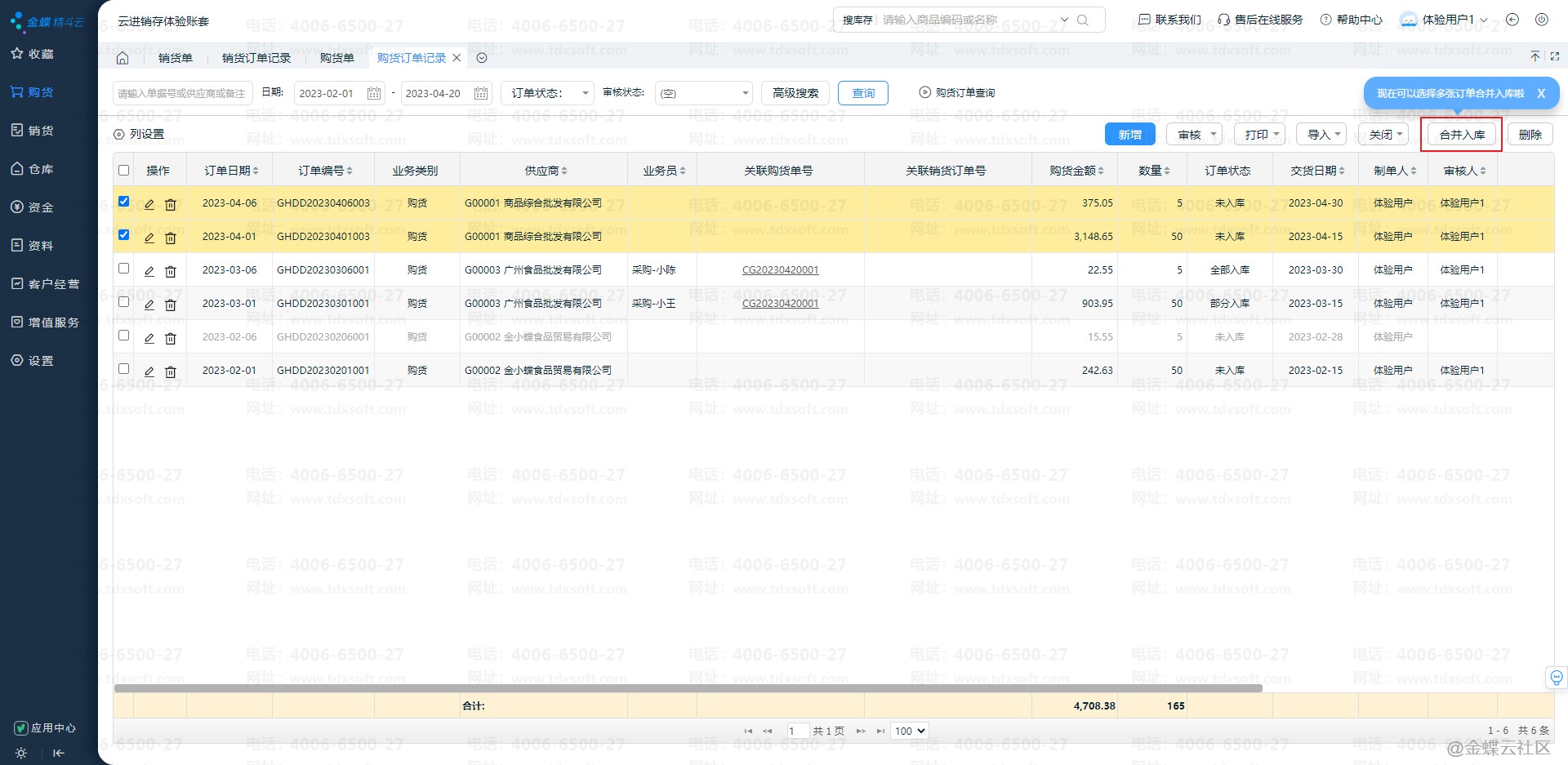 2)购货订单记录增加合并入库功能,支持选择多张订单一起入库
