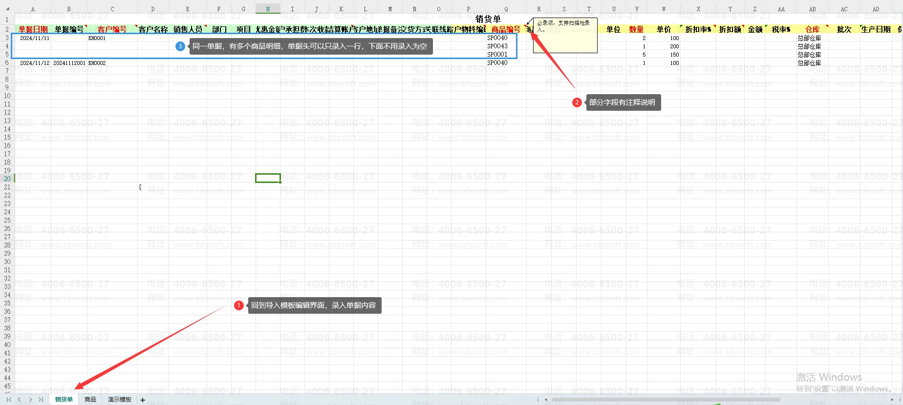 ④多笔单据可一起导入。填写时需注意在每笔单据表头的第一行,填写该单据对应的关键信息(如单据编号、单据日期等)。
