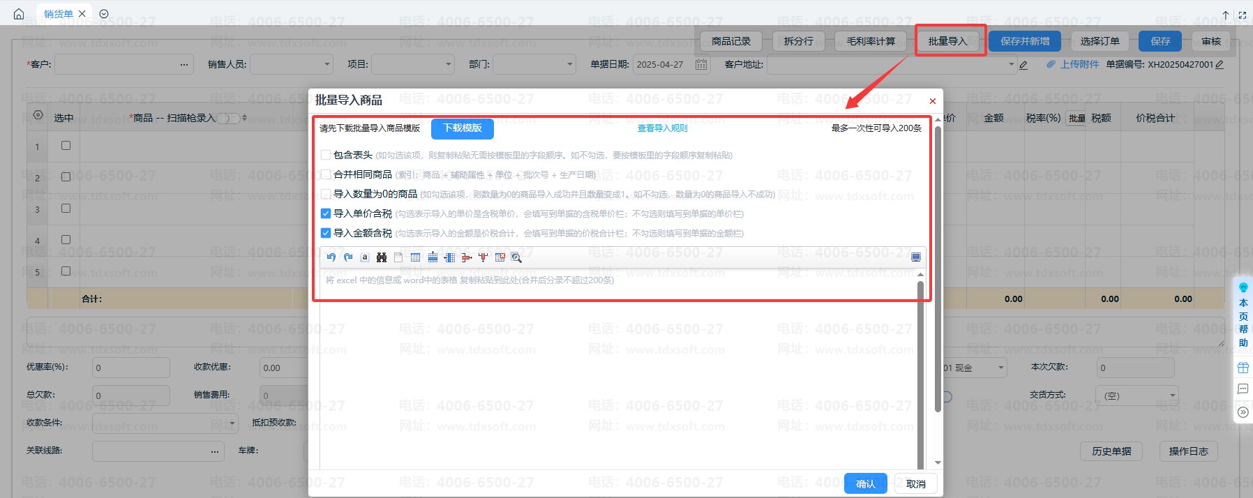 2、新增单据时,系统支持在单据编辑界面,批量导入商品资料,如图所示: