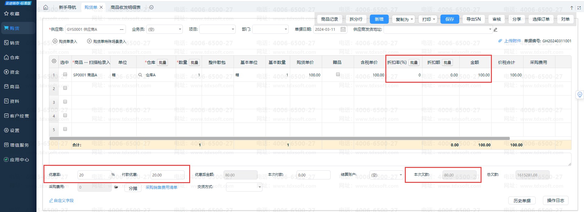如采购总金额100元,付款优惠20%,则录入优惠率为20,优惠金额为20元,入库成本仍是100元,应付80元