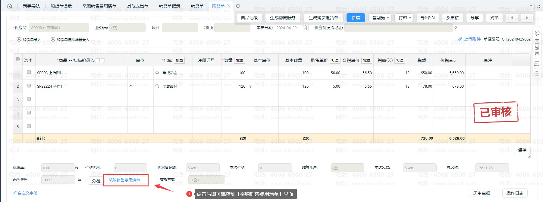 ①采购单据显示√,表示采购费用已分摊至商品入库成本