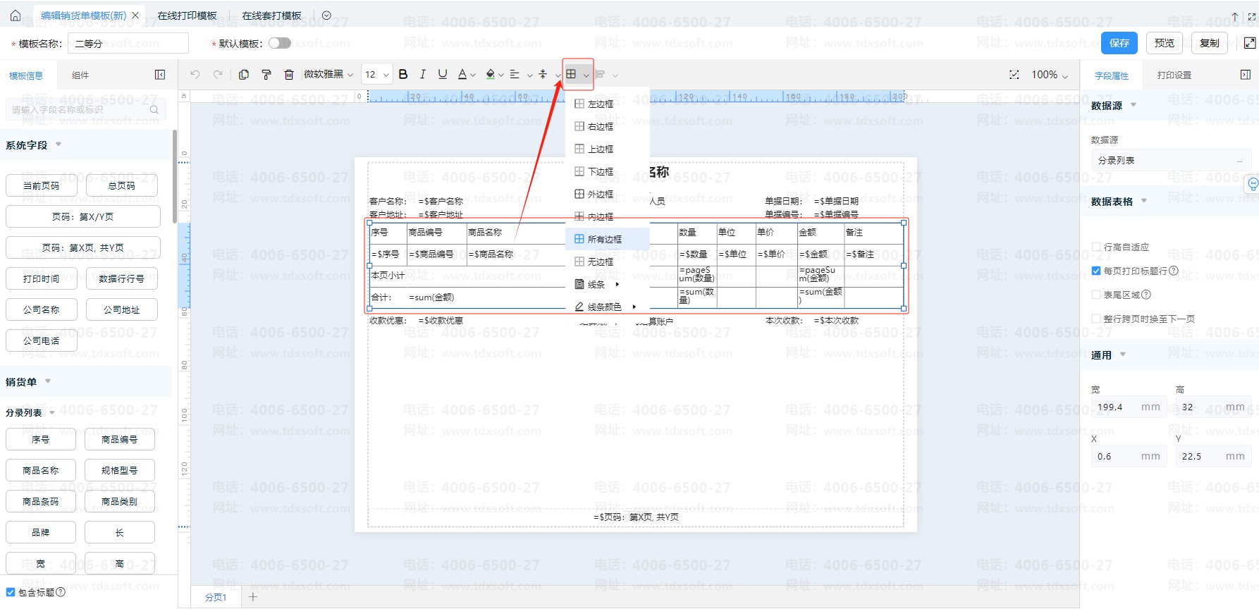 系统预设的在线套打模板默认是打印表格线,也支持自定义表格线(如打印下边框线、打印左/边框线、打印无边框线等等)。打开在线套打模板编辑界面,选中单元格,然后点击上方工具栏的“边框线”自定义选择即可。