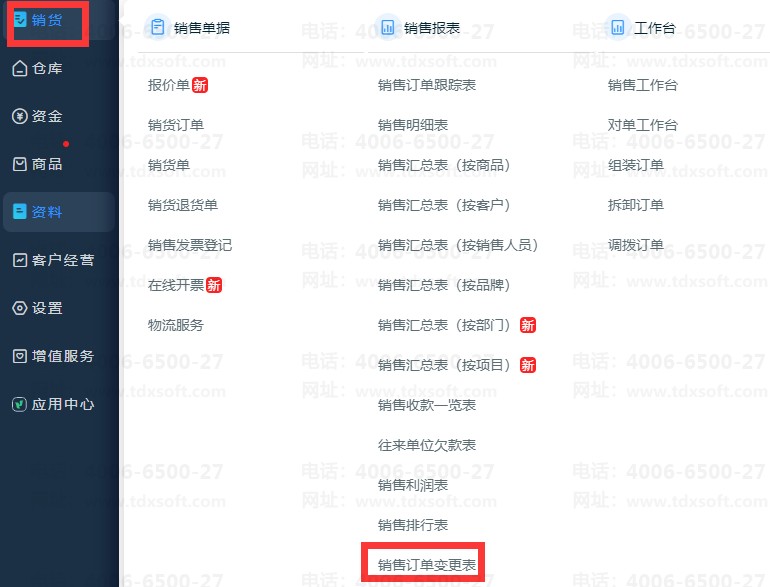 1、在【销货】-【销售订单变更表】