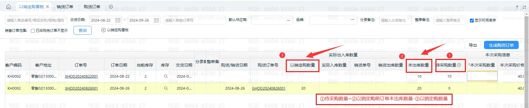 3、待采购数量=以销定购前订单未出库数量-以销定购数量; 待采购数量不能大于订单未出库数量,若按以上公式计算的待采购数量大于订单未出库数量,则取未出库数量。