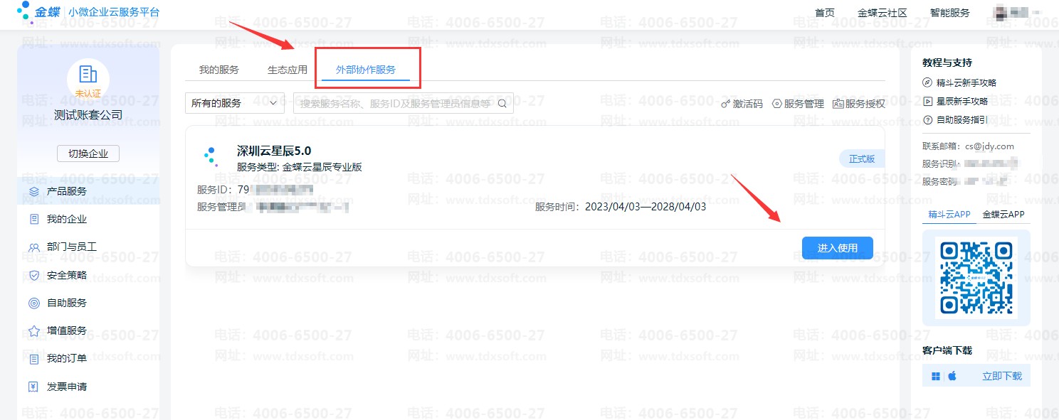 6、如果是由第三方企业的服务管理员授权当前用户使用的服务。即当前账号未加入第三方企业,仅是做为第三方企业的协作者共同操作此服务,可以在【外部协作服务】里查看,并进入服务操作。