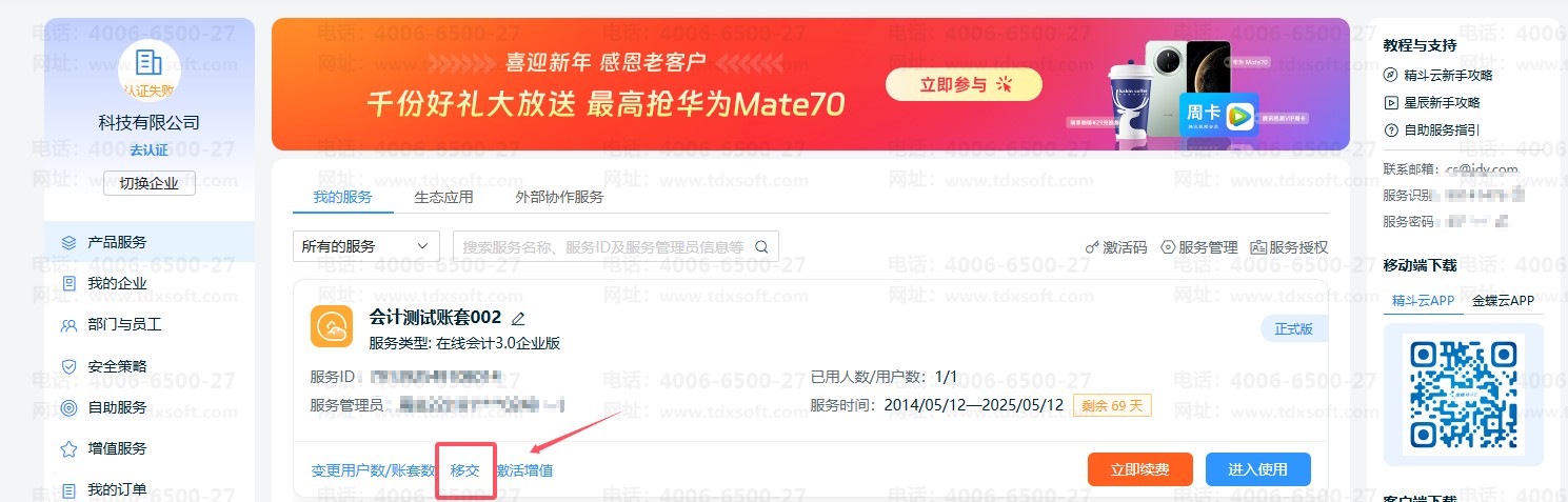 7、企业管理员做了移交操作,更换了该账套的服务管理员,导致原服务管理员账号登录后,看不到账套。可以让新的服务管理员,重新授权给原账号即可。