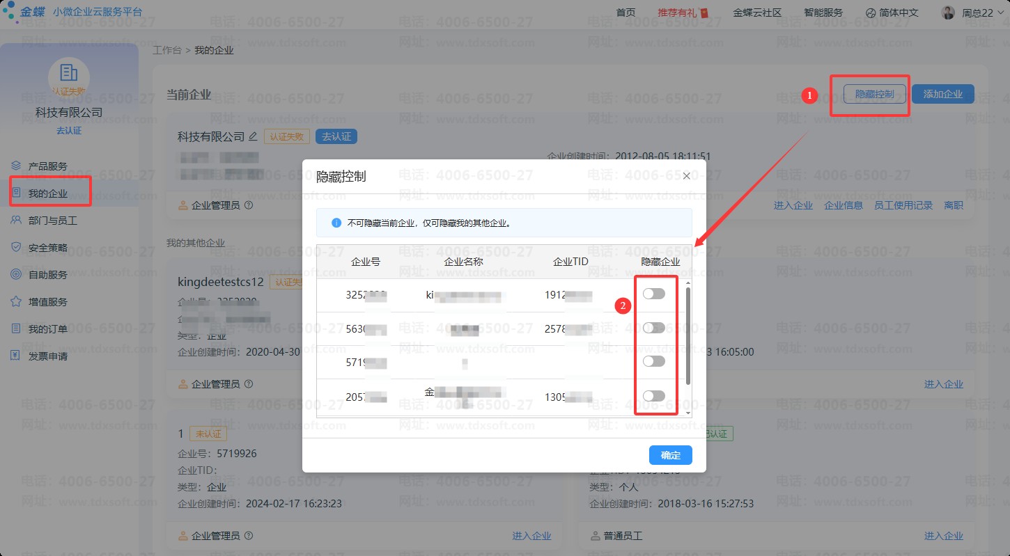 注意:在【我的企业】界面,请点击右上角【隐藏控制】是否有企业被隐藏未展示。