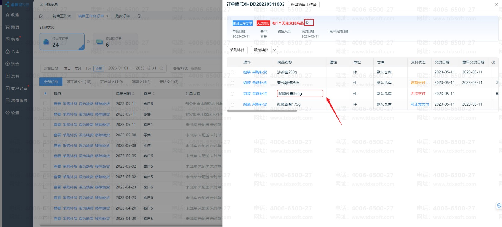 若订单无法按时交货,可点击【设为缺货】,交付状态会变为“无法交付”;后续商品到货后可【移除缺货】