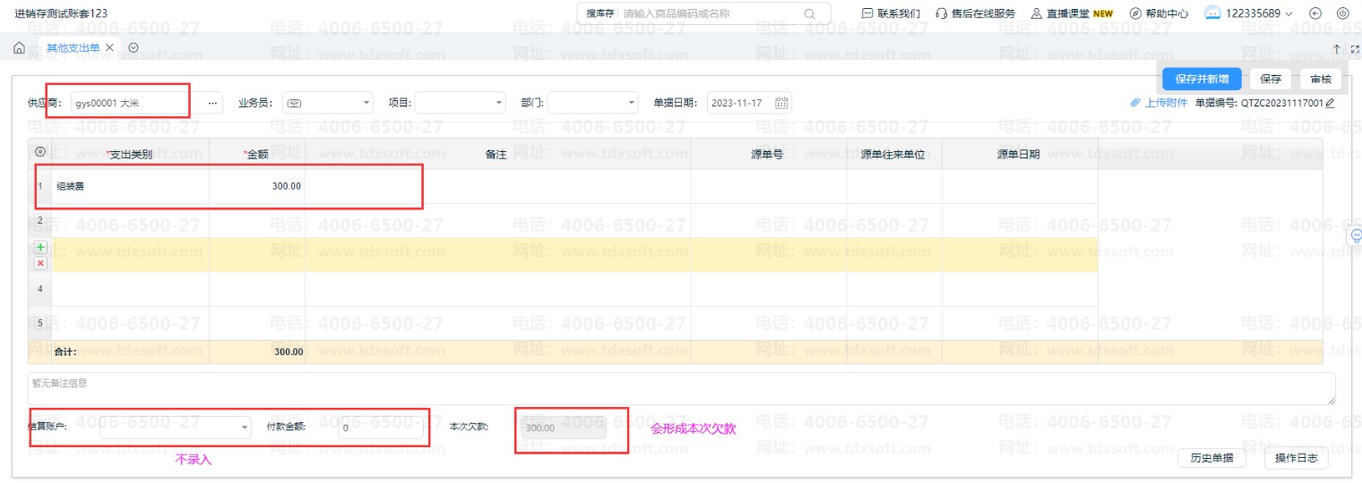 如果需要先形成一笔应付,做其他支出单不录付款金额,只录入上方的供应商、支出类别、金额,保存审核单据