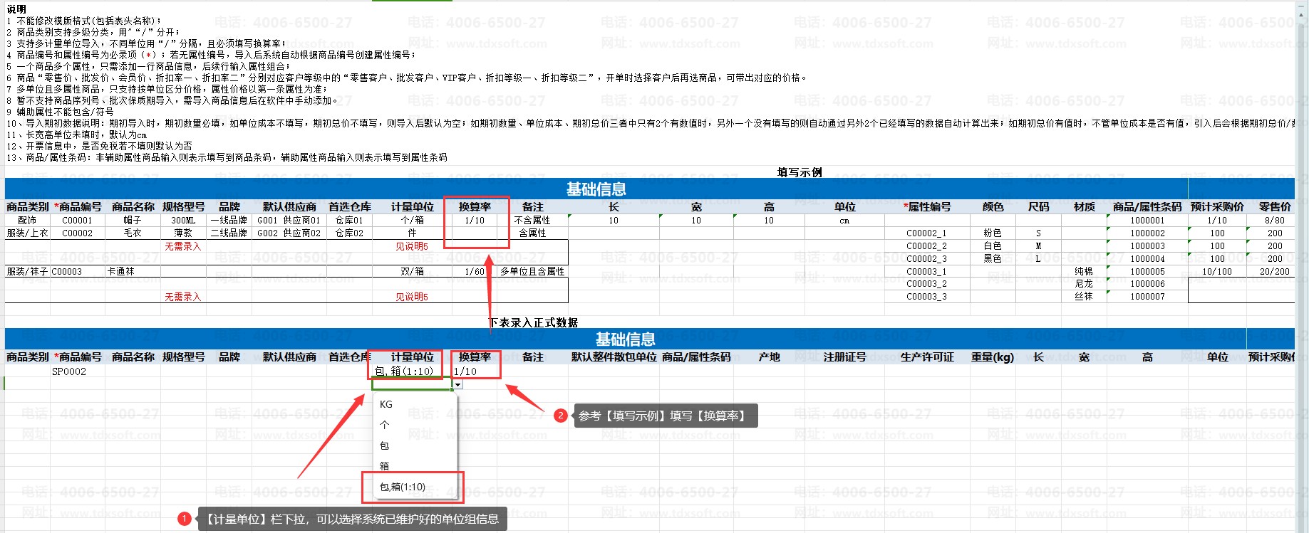 模板上的换算率为纯数值,需要填写清楚基本单位与副单位的换算关系。