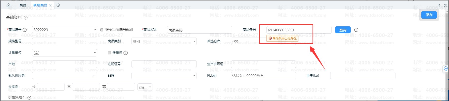 3、若其他商品有使用过一样的商品条码,新增的商品时系统会自动检测到并提示“商品条码已经存在”(不支持一码多品)。