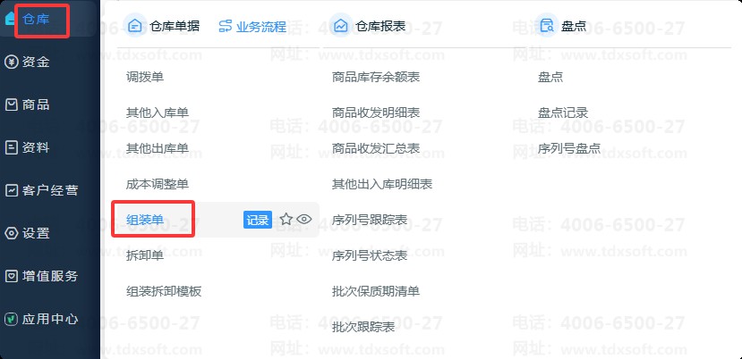 1、点击【仓库】-【组装单】即可打开新增组装单界面。