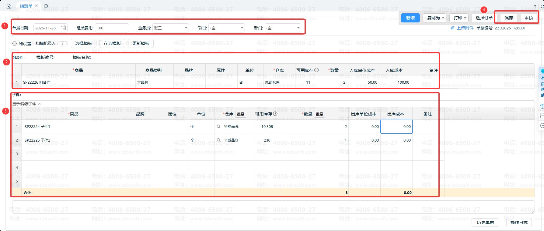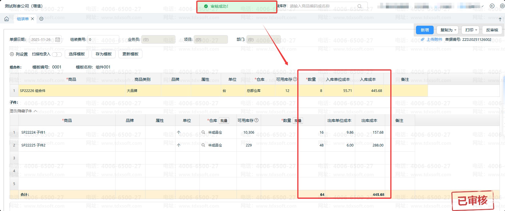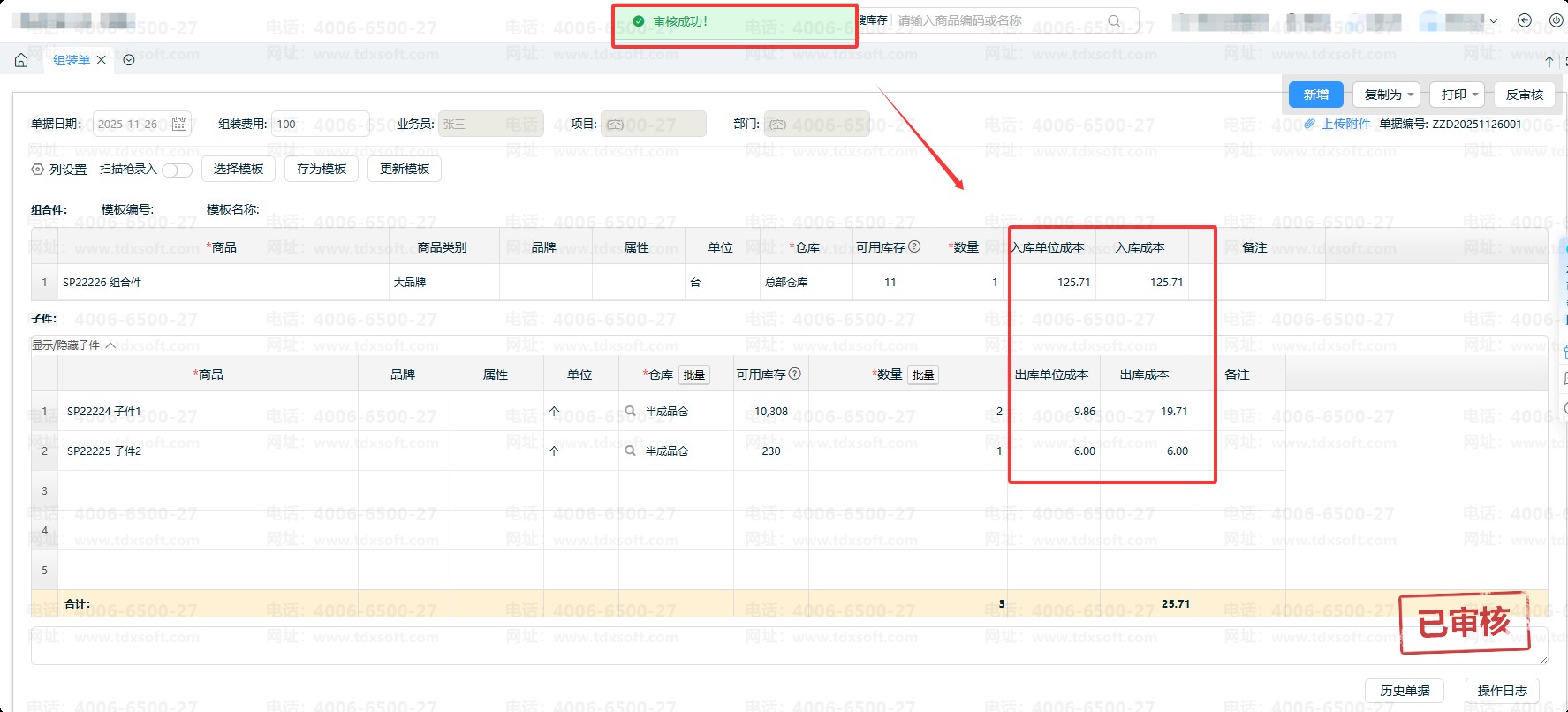 ⑤组装单需【保存】(若系统开启审核功能,需【审核】)后,系统才会自动核算单据相关成本;未保存或未审核的单据,不会显示商品成本信息。
