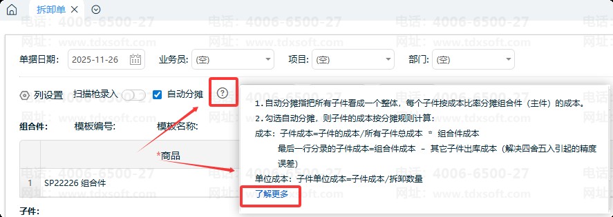 ②自动分摊:勾选“自动分摊”,则子件的成本按系统预设的分摊规则计算。具体规则说明可点击【了解更多】查看。