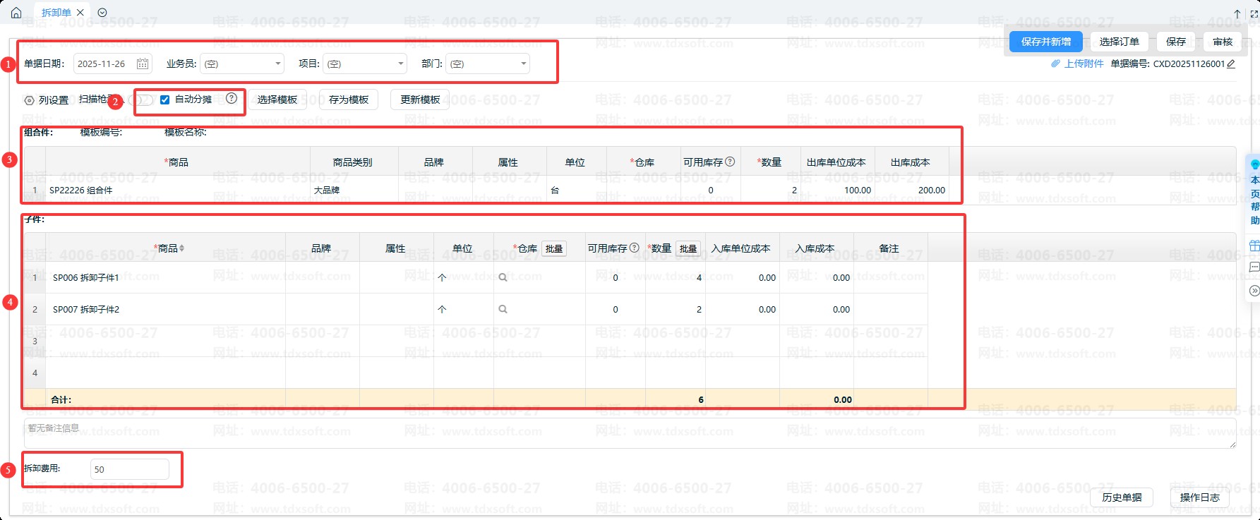 2、拆卸单:是将一个组合件拆成多个子件,其业务逻辑为:一种组合件出库,多种子件入库;子件入库成本合计=组合件出库成本+拆卸费用(默认勾选:按照子件初始成本的比例“自动分摊”)