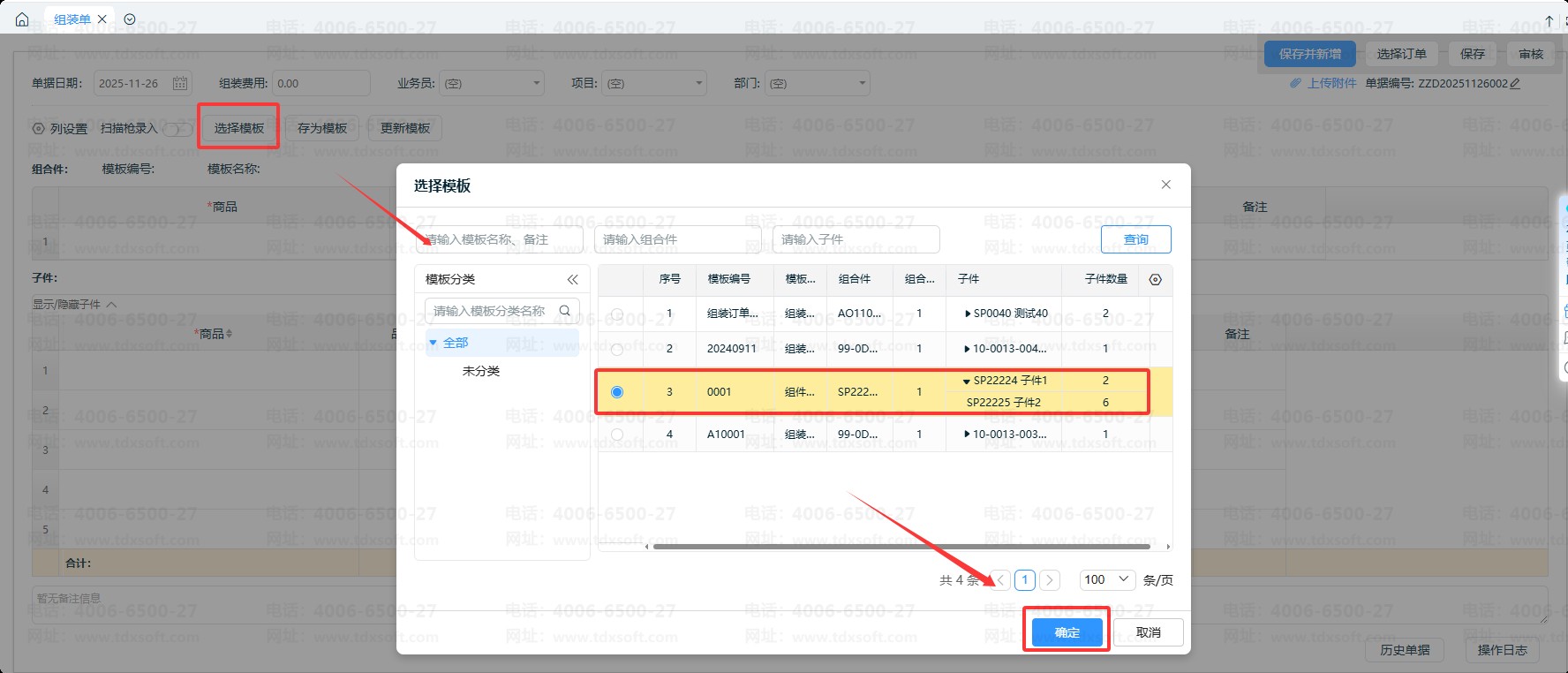 1、打开组装单编辑界面,点击【选择模板】,可预先设置好的组装单模板。点击【确定】后,带出模板商品信息(包括组件、子件、及数量配比关系);
