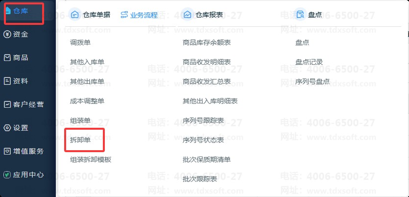 1、点击【仓库】-【拆卸单】即可打开新增拆卸单界面。