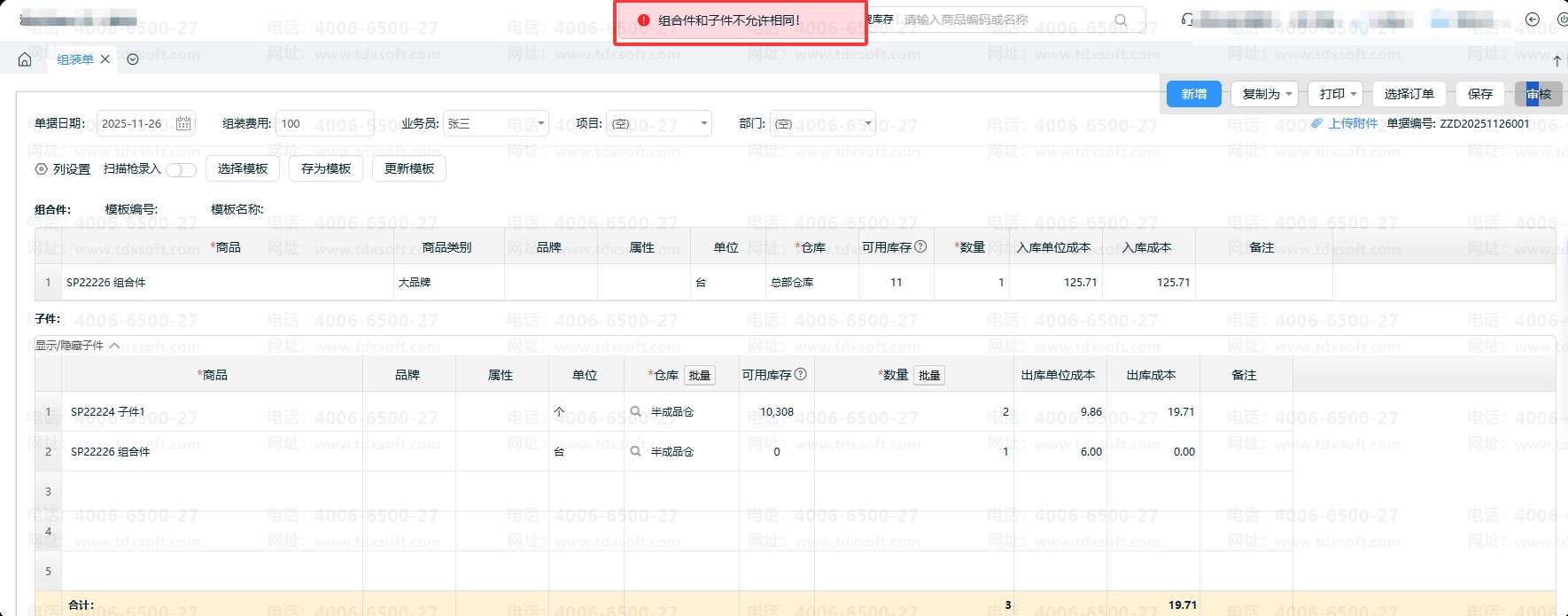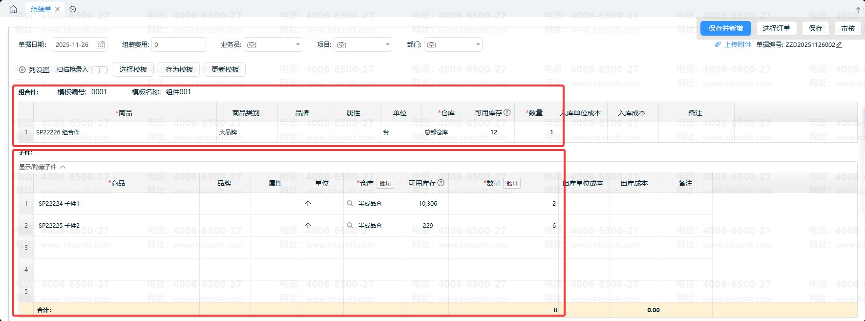经常组装/拆卸的商品,录入组合件、子件后可存为模板,方便下次直接选择模板,无需重复录入商品。