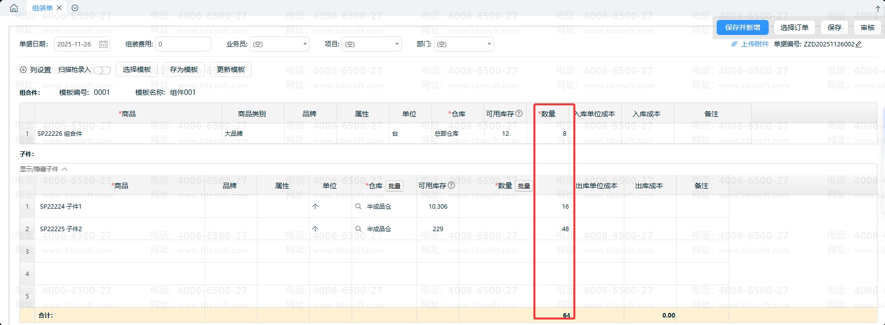 2、可根据实际业务场景,手工修改组合件数量,系统会按模板配比关系,自动更新子件数量。