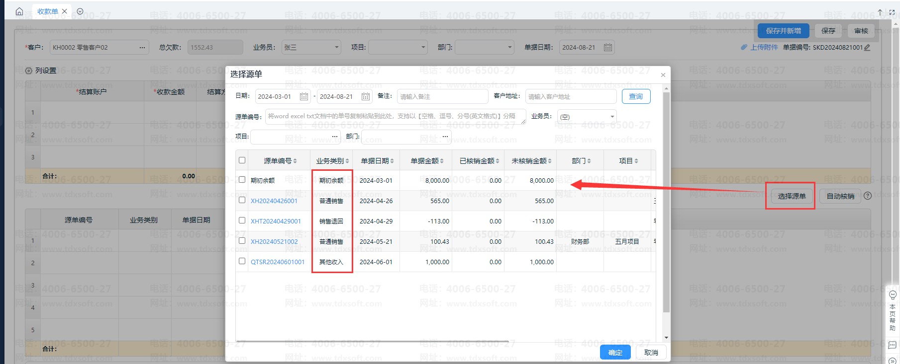 云进销存收款单能够选择的源单类型有哪些
