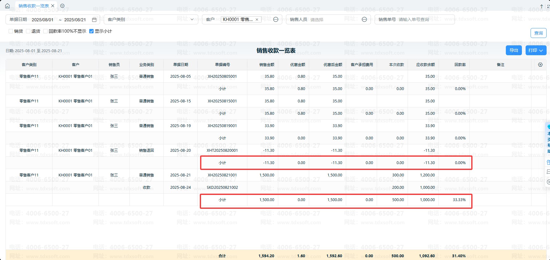 2、查询时勾选“小计”:系统将仅已全部收款或未 100% 收款的单据,并同步计算且显示每笔单据的实际回款率。