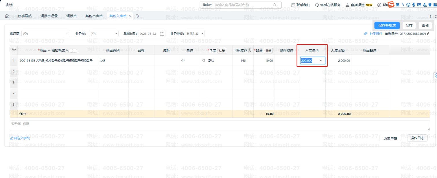 然后,在【仓库】-【其他入库单】,录入其他入库单,输入入库单价,实现调拨入库