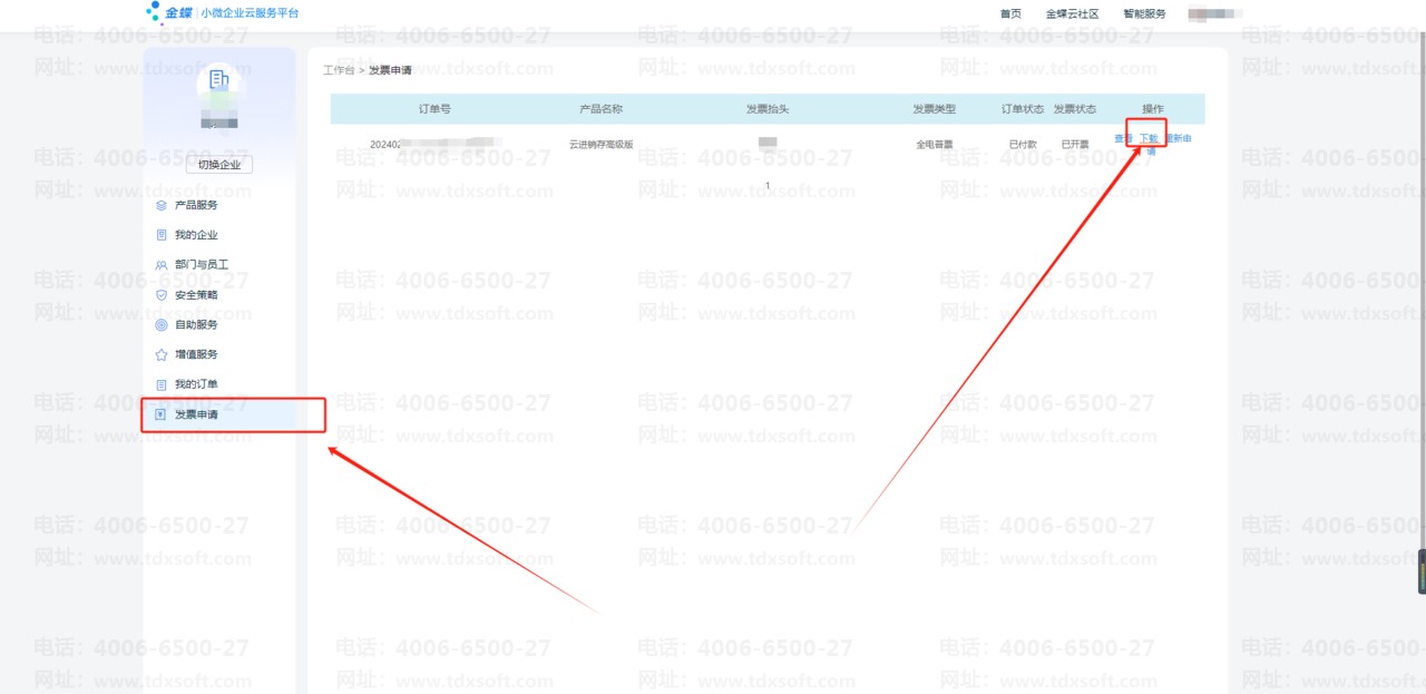 如您当前登录的是企业管理员的账号,可以点击:申请发票,将直接跳转至发票申请界面。(如已申请过开票,点击查看:订单发票开具查询操作)