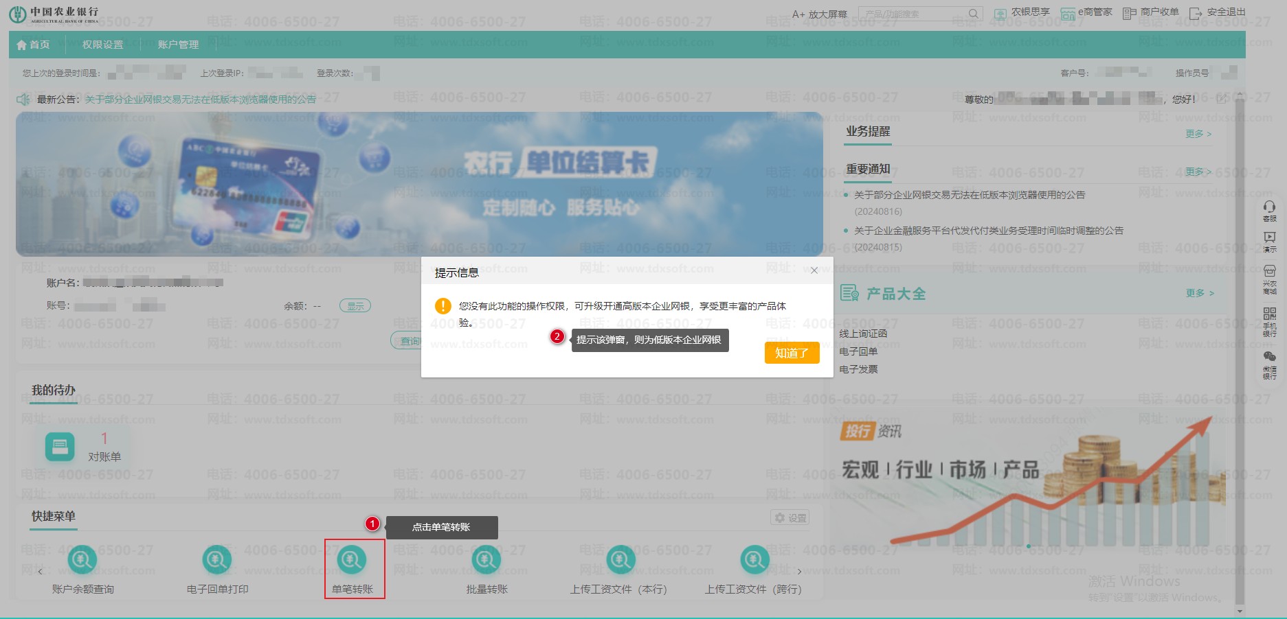 ④点击批量转账、单笔转账,弹窗提示如下,则为低版本企业网银,所以账号密码不会涉及转账交易,您可以放心!