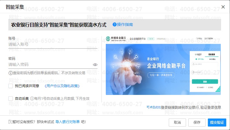 首次验证成功后,您可点击【一键获取】按钮或顶部状态栏的【立即体验智能采集】,选择【农业银行】选项,弹出采集设置弹窗。