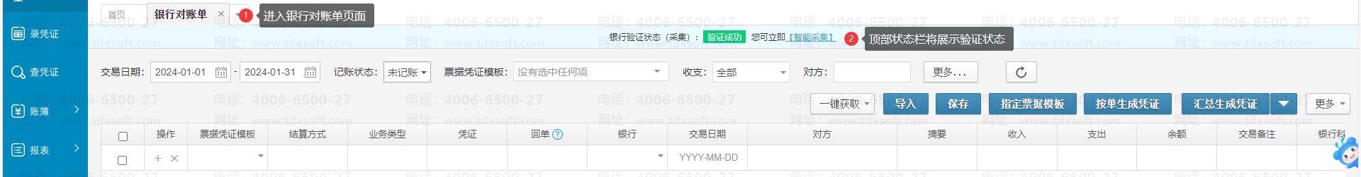 采集完成后,采集流水将在银行对账单页面展示,您可按照需求选择票据凭证模板然后生成凭证,也可点击回单下的图片图标查看银行回单。