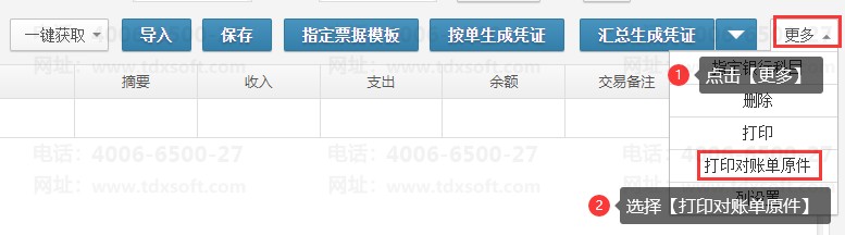 系统可采集到招商银行的对账单原件,您可点击【更多】→【打印对账单原件】,弹出打印设置弹窗后,选择您需要打印的期间,即可预览并打印对应期间的对账单原件。