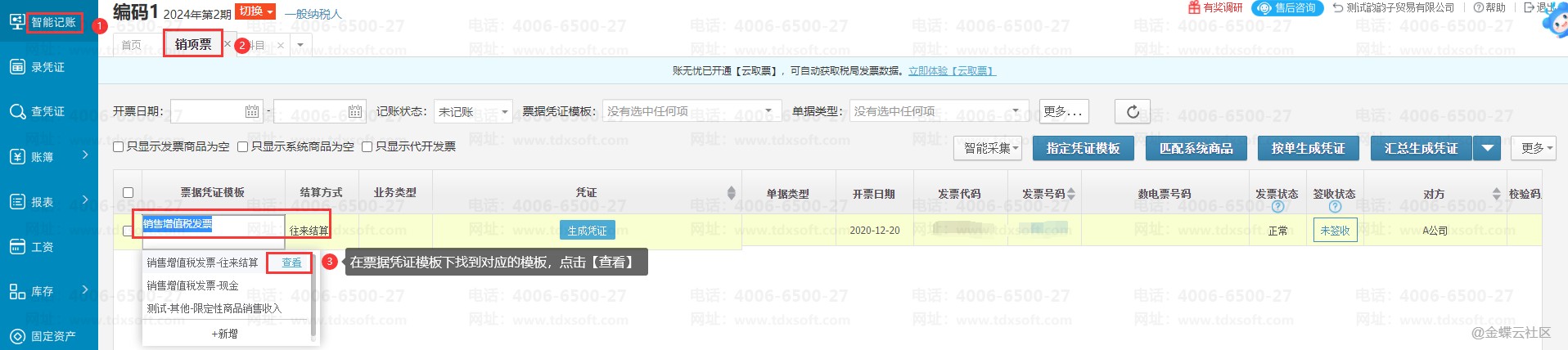 点击【智能记账】→【销项票】,在票据凭证模板下找到对应的模板,点击【查看】按钮。