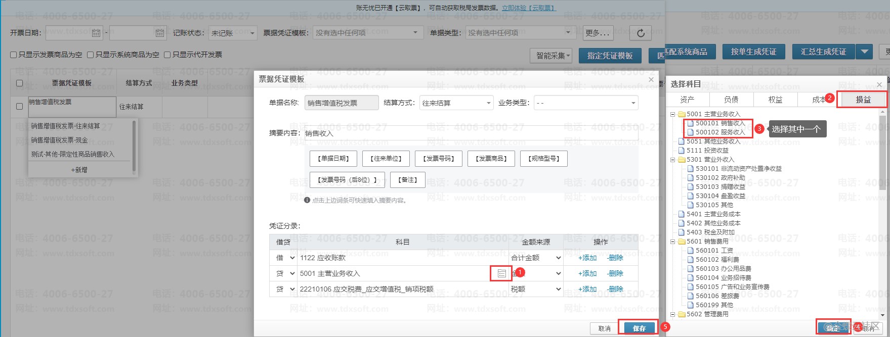 情况一:主营业务收入的二级科目是大类:销售收入、服务收入、内销、外销等之类的,则直接将模板科目修改为需要生成的二级科目大类后,点击【确定】→【保存】按钮,并刷新网页后重新去生成凭证。