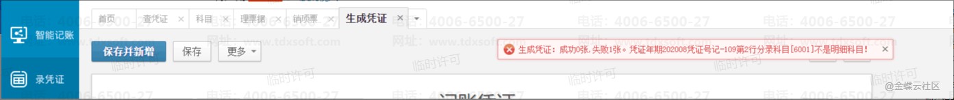 金蝶账无忧销项发票生成凭证失败提示主营业务收入非明细科目