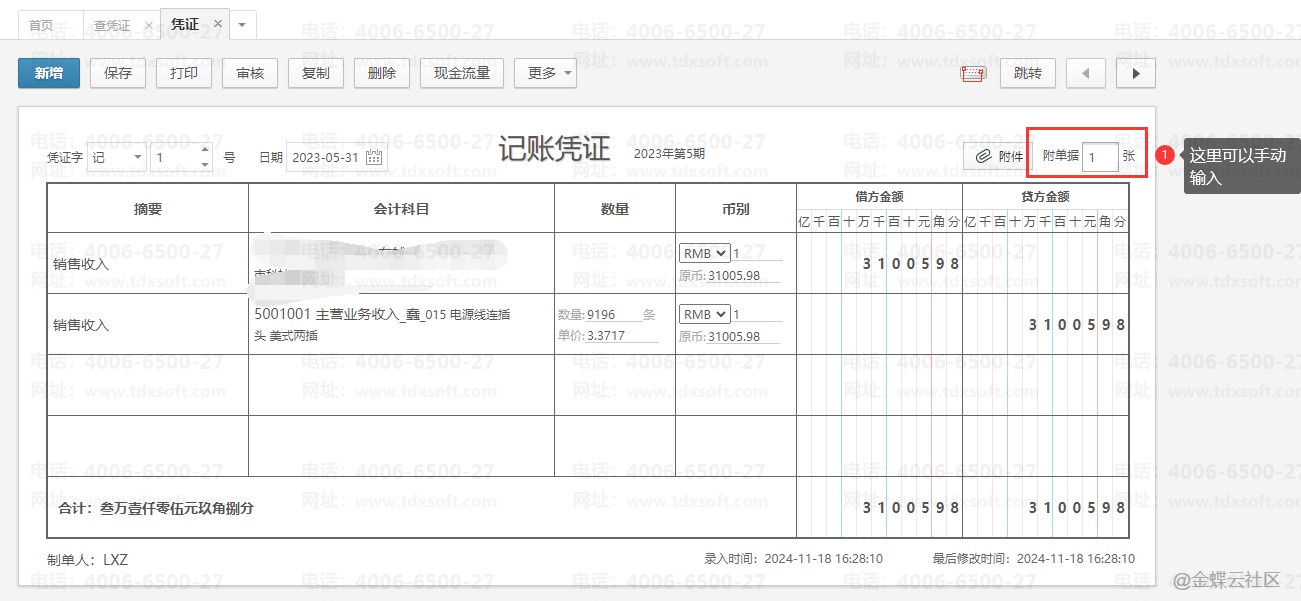 情况一:手动输入过凭证的附件数,可以点击凭证手动修改附单据的数量,然后点击【保存】按钮