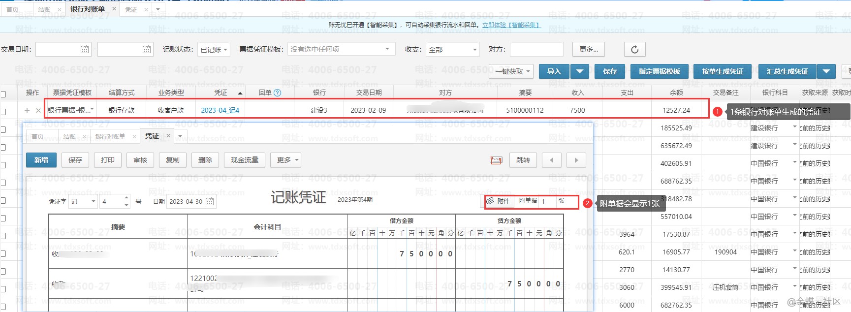 情况二:从银行对账单生成的凭证,根据几条对账单生成凭证,这里就会显示附件数几,但是不会显示附件图像
