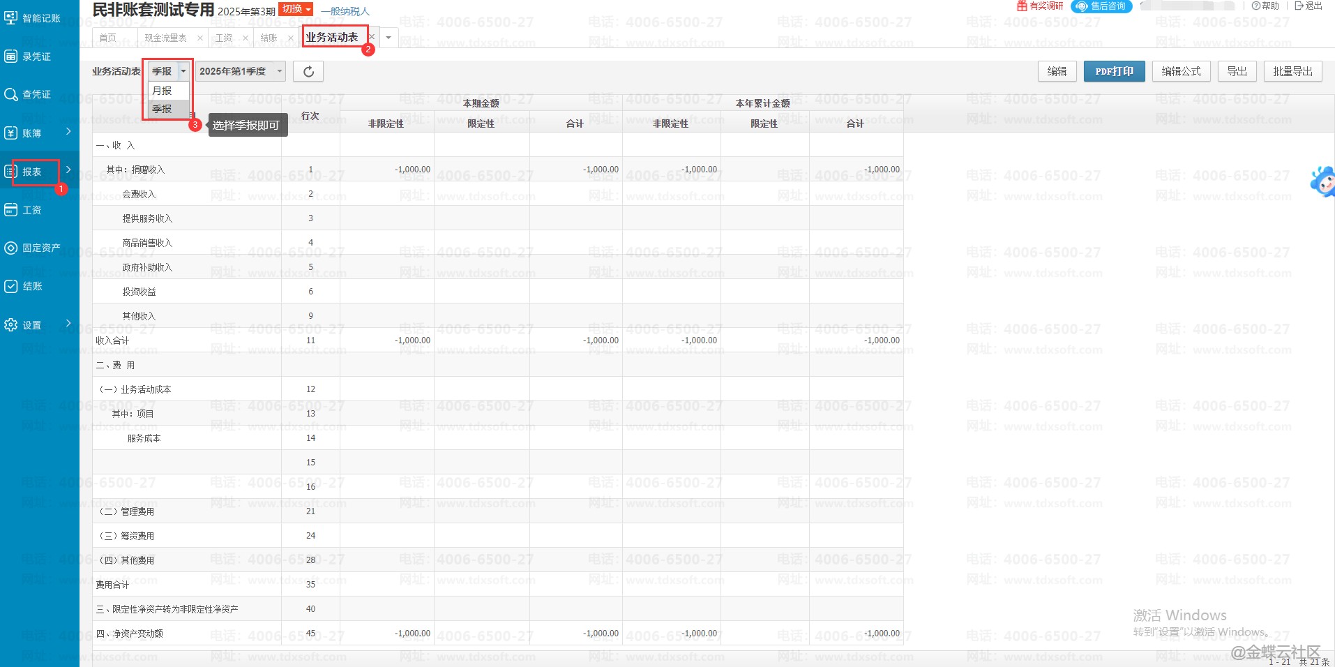 进账簿后,点击【报表】→【业务活动表】点击下拉框出现切换成季报后可以选择需要查看的季度数据。