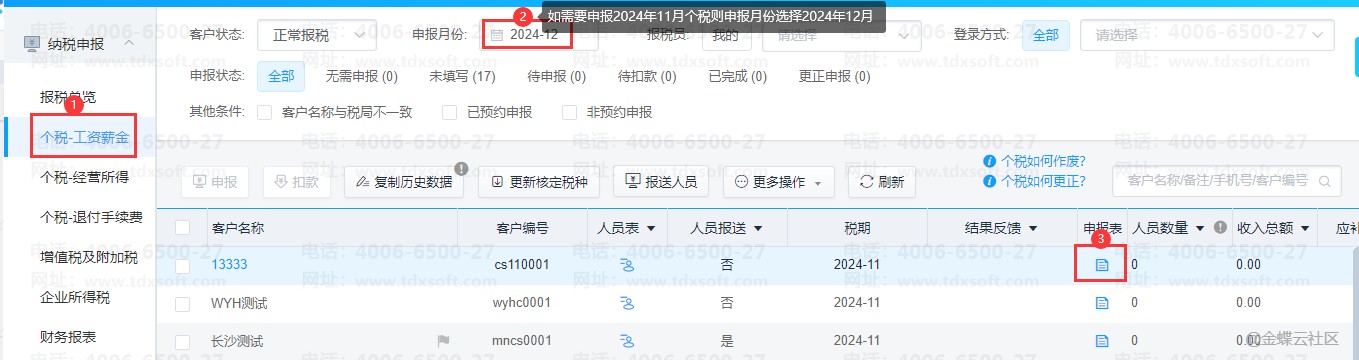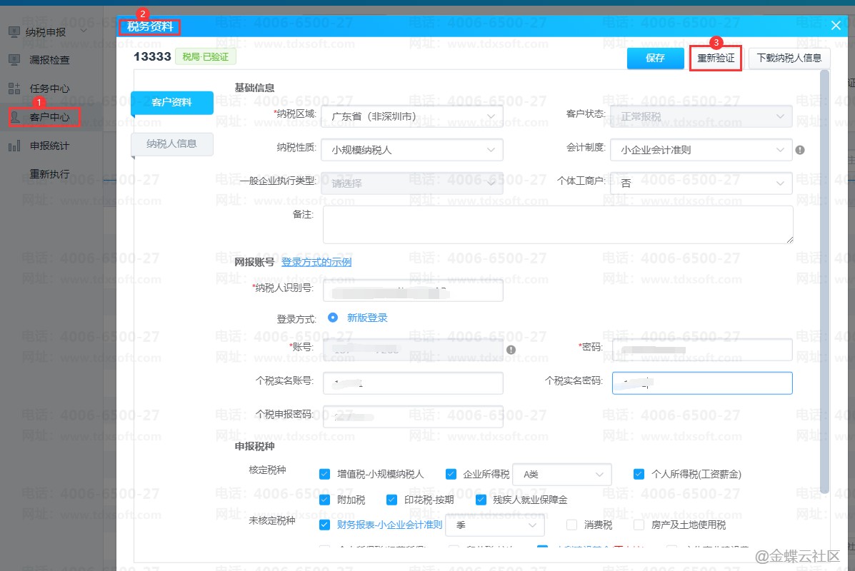 2.需重新操作税局验证,点击客户名称在税务资料里点击【重新验证】。再到【个税-工资薪金】界面选择申报月份到下月后,填写当月申报表后进行申报当月的个税。
